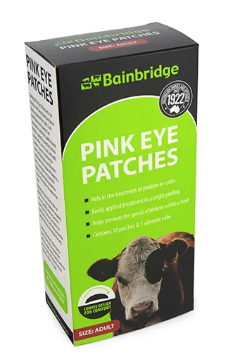Bainbridge Pink Eye Patches aids in the treatment of pinkeye (infectious bovine keratoconjuctivitis) in cattle. Early identification and treatment are important to control this painful disease. Covering the eye promotes healing, and also helps prevent the spread of the disease throughout the herd.