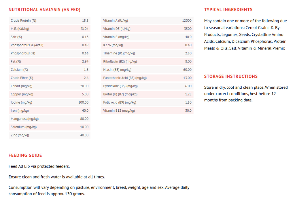 A complete ration designed for 7 weeks of age onwards. This formulated feed will meet the nutritional requirements for optimum health in meat and egg birds.