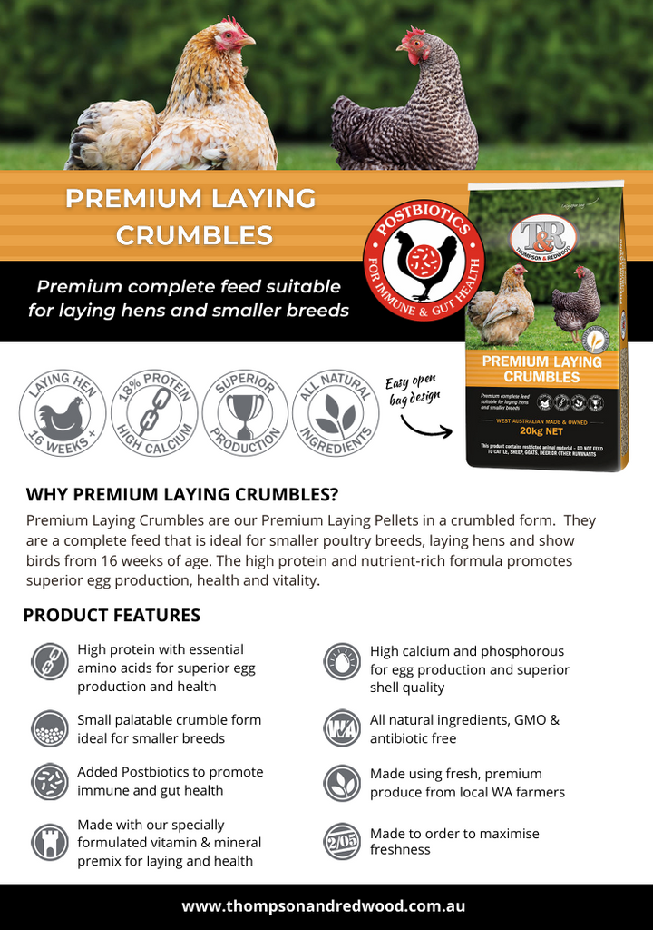 A premium, complete feed in a crumbled form that is ideal for smaller chickens, laying hens and show birds from 16 weeks. The high protein, nutrient-rich formula is vegetarian friendly, and promotes superior egg production, health and vitality.