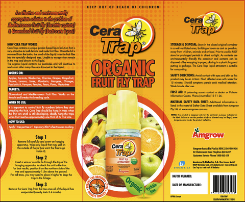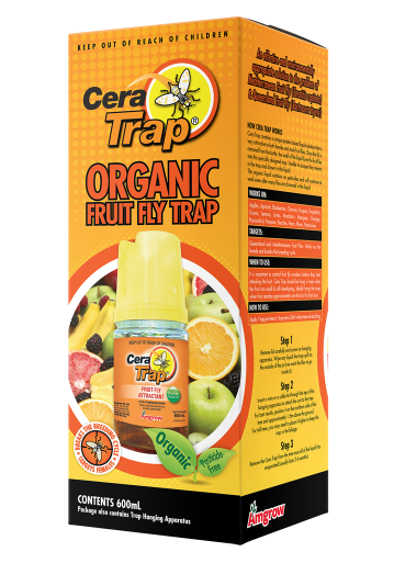 The effective and environmentally appropriate solution to the problem of Mediterranean Fruit Fly (Ceratitis capitata) and Queensland Fruit Fly (Bactrocera tryoni). Targets both male and female fruit fly. Use Cera Trap before fruit flies start attacking the fruit. Cera Trap should be hung in trees when the fruit are small and still developing. Ideally, hang the traps when fruit reaches approximately one third its final size. The traps should be hung on the northern side of the tree, at a height of approximately 1.5 metres and within the tree canopy.