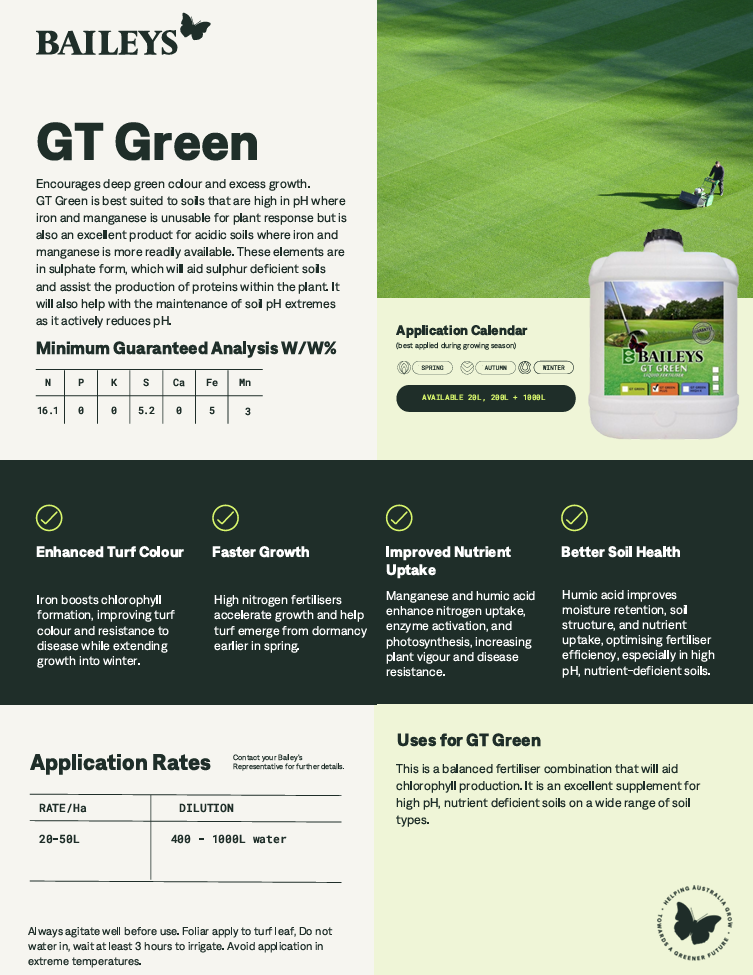 A liquid fertiliser formulated to encourage deep green colour and excess growth. GT Green is best suited to soils that are high in pH where iron and manganese is unusable for plant response but is also an excellent product for acidic soils where iron and manganese is more readily available. These elements are in sulphate form, which will aid sulphur deficient soils and assist the production of proteins within the plant. It will also help with the maintenance of soil pH