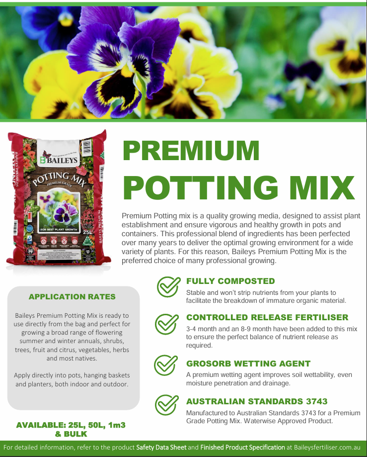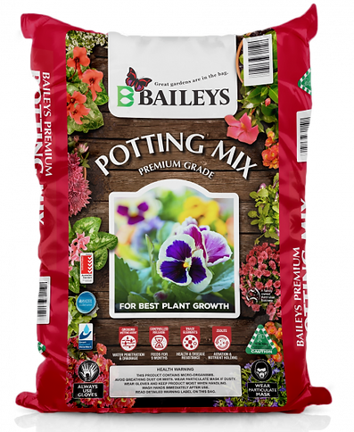 BAILEYS PREMIUM POTTING MIX is a quality growing media, designed to assist plant establishment and ensure vigorous and healthy growth in pots and containers. This professional blend of ingredients has been perfected over many years to deliver the optimal growing environment for a wide variety of plants. For this reason, Baileys Premium Potting Mix is the preferred choice of many professional growers.
