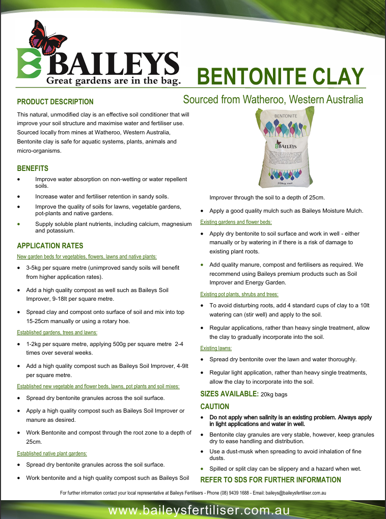 This natural, unmodified clay is an effective soil conditioner that will improve your soil structure and maximise water and fertiliser use. Sourced locally from mines at Watheroo, Western Australia, Bentonite clay is safe for aquatic systems, plants, animals and micro-organisms.