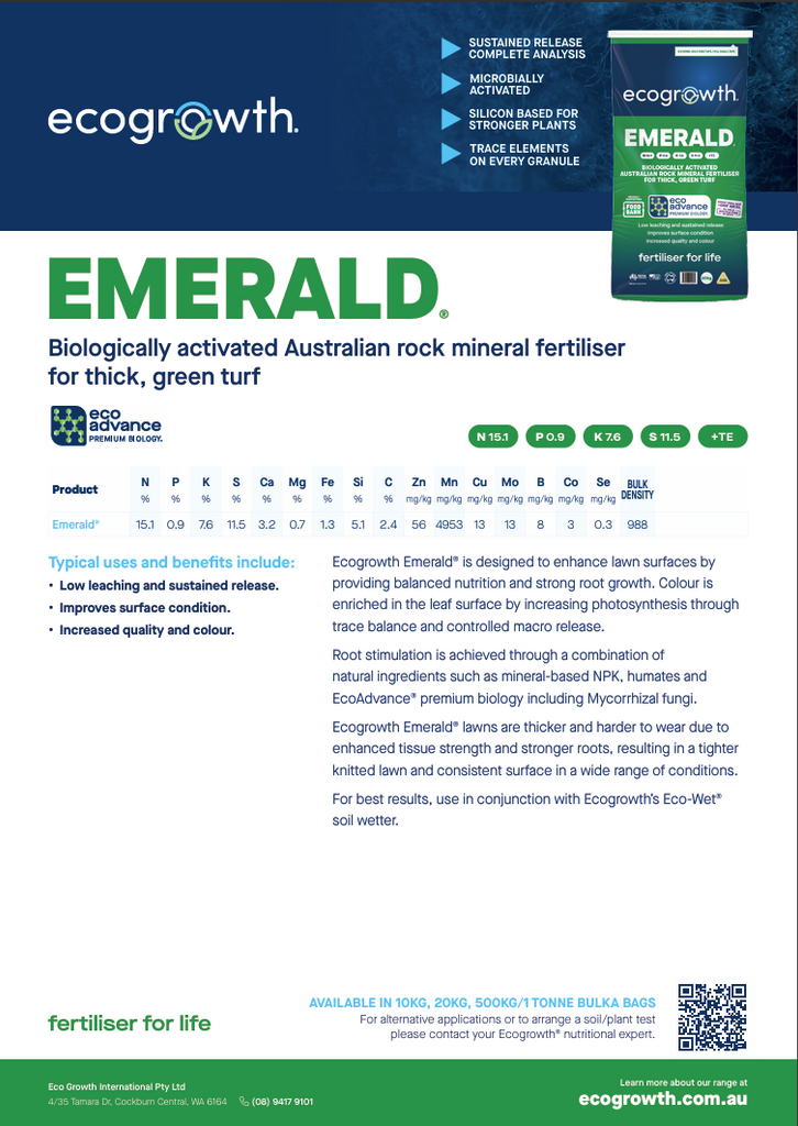 Ecogrowth Emerald® is designed to enhance lawn surfaces by providing balanced nutrition and strong root growth. Colour is enriched in the leaf surface by increasing photosynthesis through trace balance and controlled macro release.