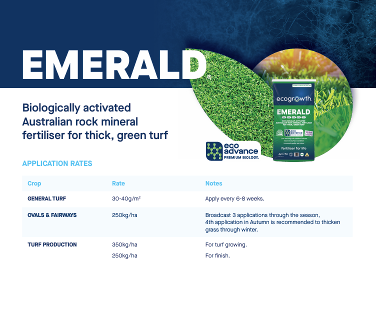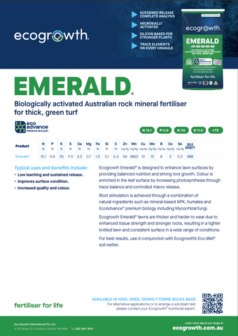 Ecogrowth Emerald® Lawn Fertiliser is a complete rock mineral NPK fertiliser impregnated with beneficial microbes.