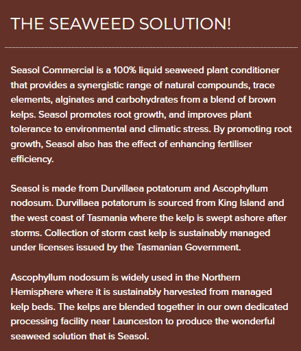 Seasol Commercial Seasol is a 100% liquid seaweed plant conditioner that provides a synergistic range of natural compounds, trace elements, alginates and carbohydrates from a blend of brown kelps.