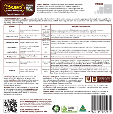 Features and Benefits of Seasol Commercial: Aids plant establishment and reduces transplant shock Stimulates root growth and enhances flowering Enhances soil microbial activity Increases tolerance to adverse environmental conditions