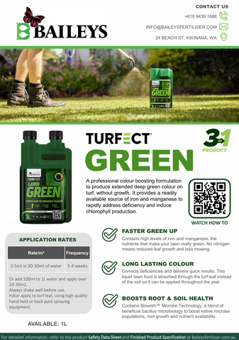 Turfect® GREEN is a professional colour boosting formulation to produce extended deep green colour on turf, without growth. It provides a readily available source of iron and manganese to rapidly address deficiency and induce chlorophyll production.