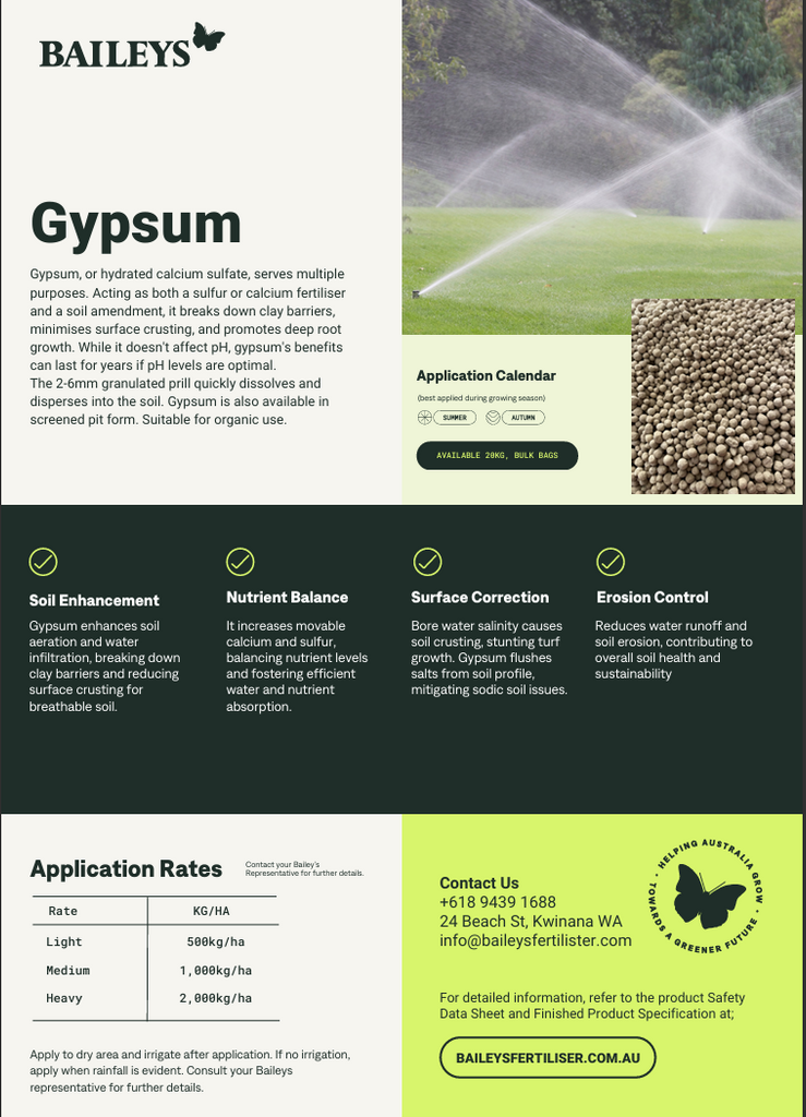 The 2-6mm granulated prill quickly dissolves and disperses into the soil. Gypsum is also available in screened pit form. Suitable for organic use.