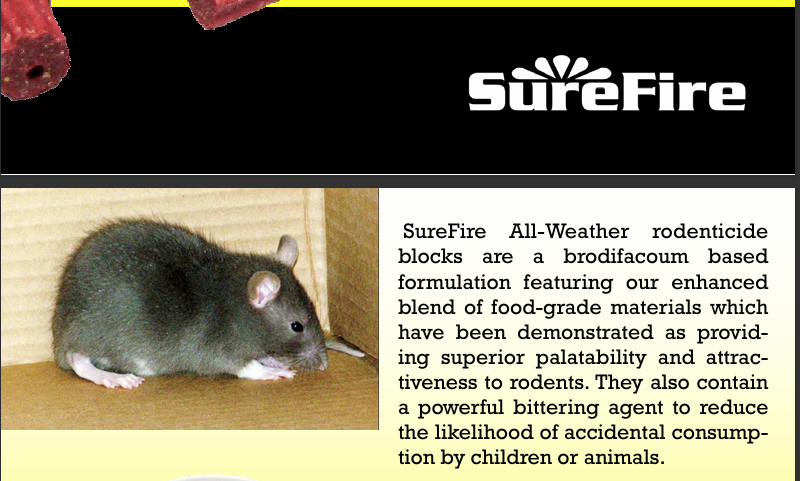 Ready to use wax-based block bait for use in dry or damp siuations in and around industrial, commercial, agricultural and domestic buildings, exterior and interior of buidlings and structures.