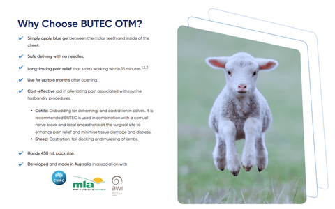 BUTEC OTM Pain Relief for Cattle and Sheep is a non-steroidal anti-inflammatory drug (NSAID) for the alleviation of pain associated with routine husbandry procedures in cattle and sheep.